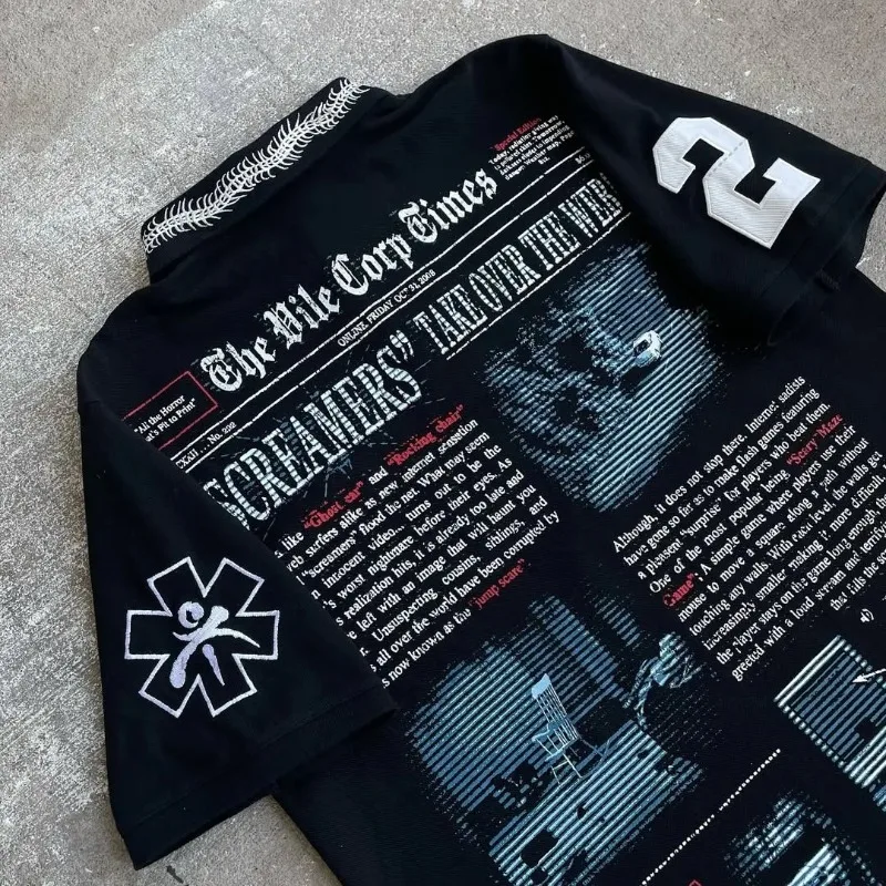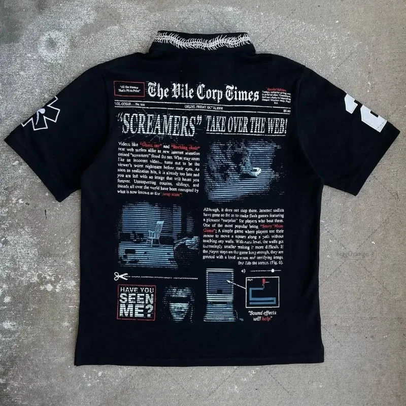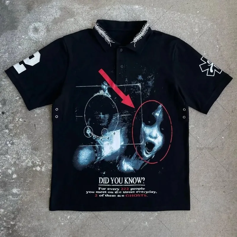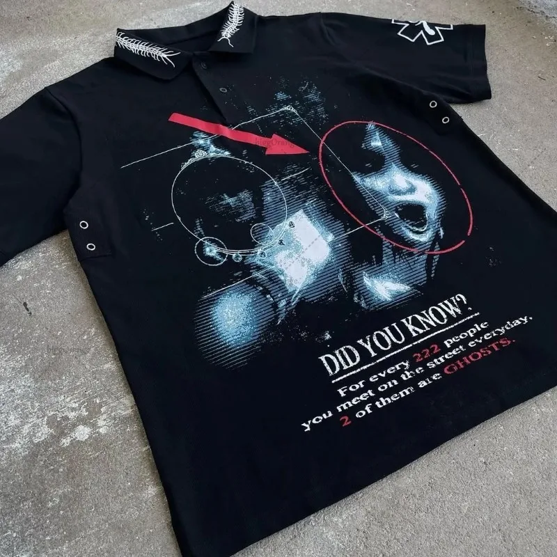 Gothic Harajuku Retro Streetwear Graphic Top Hip Hop Punk Casual Polo Shirt Men High Street Casual Cotton Lapel Short Sleeves